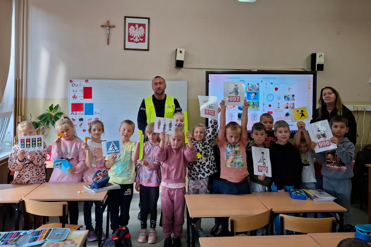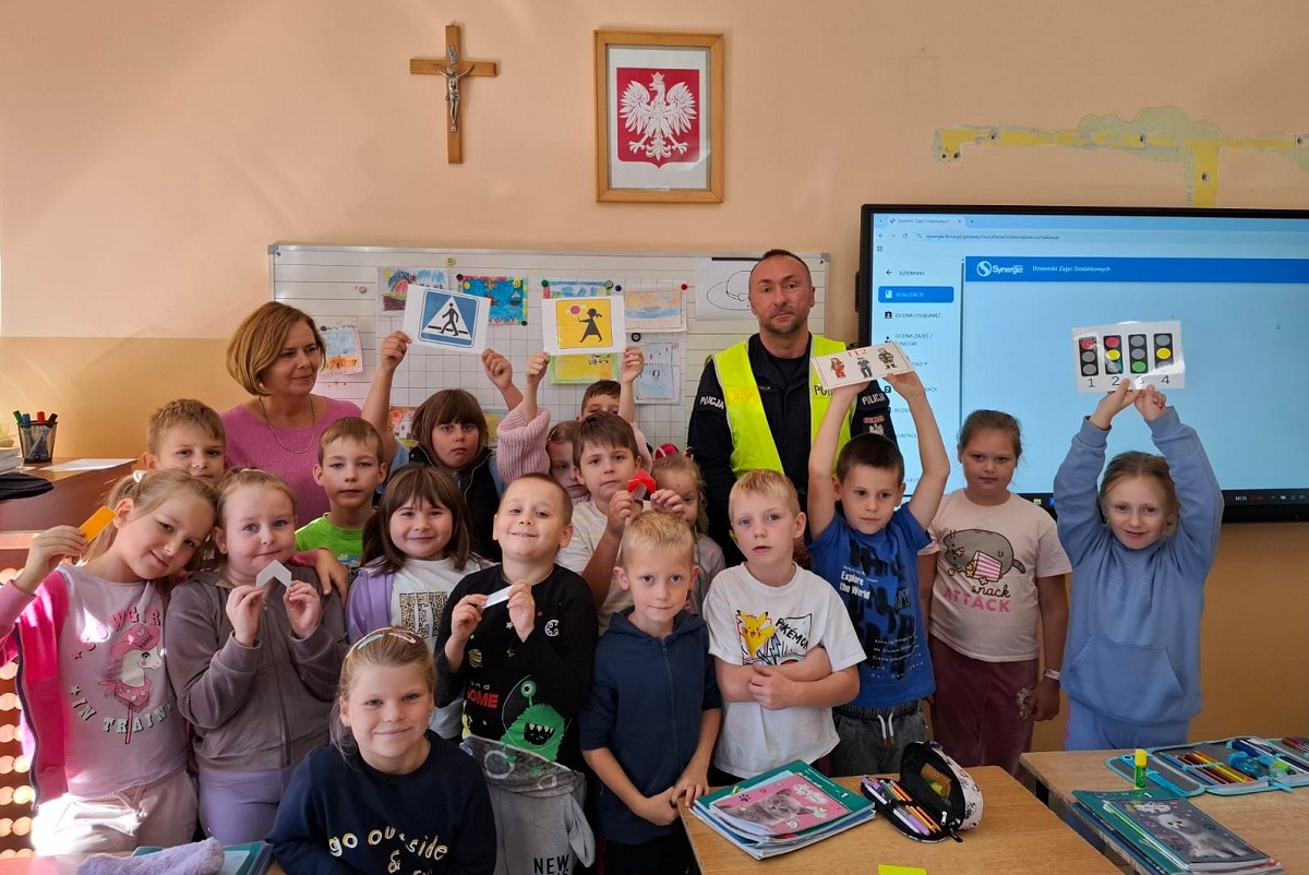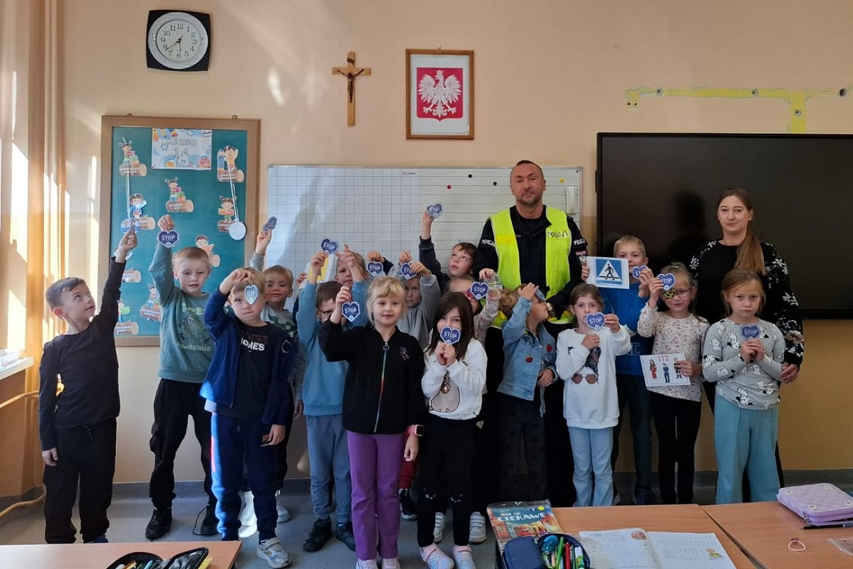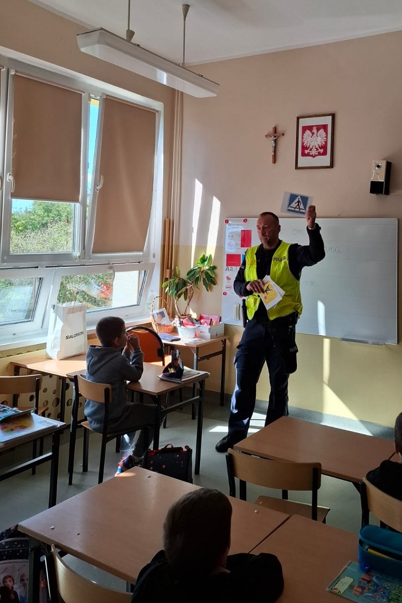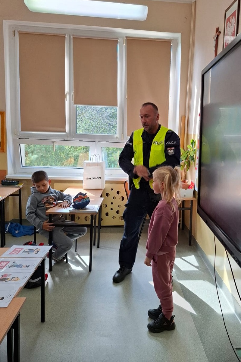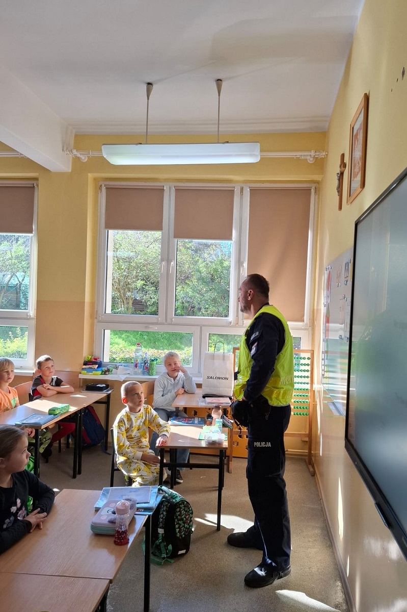 Spotkanie policjanta z dziećmi odbyło się w ramach akcji „Bezpieczna droga do szkoły”, której celem jest uświadamianie i przypominanie wszystkim o przestrzeganiu przepisów i potrzebie zachowania ostrożności na drodze.