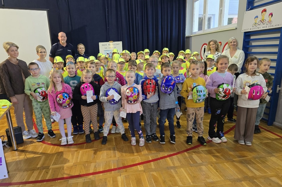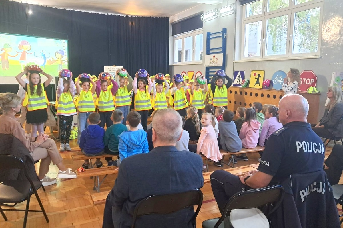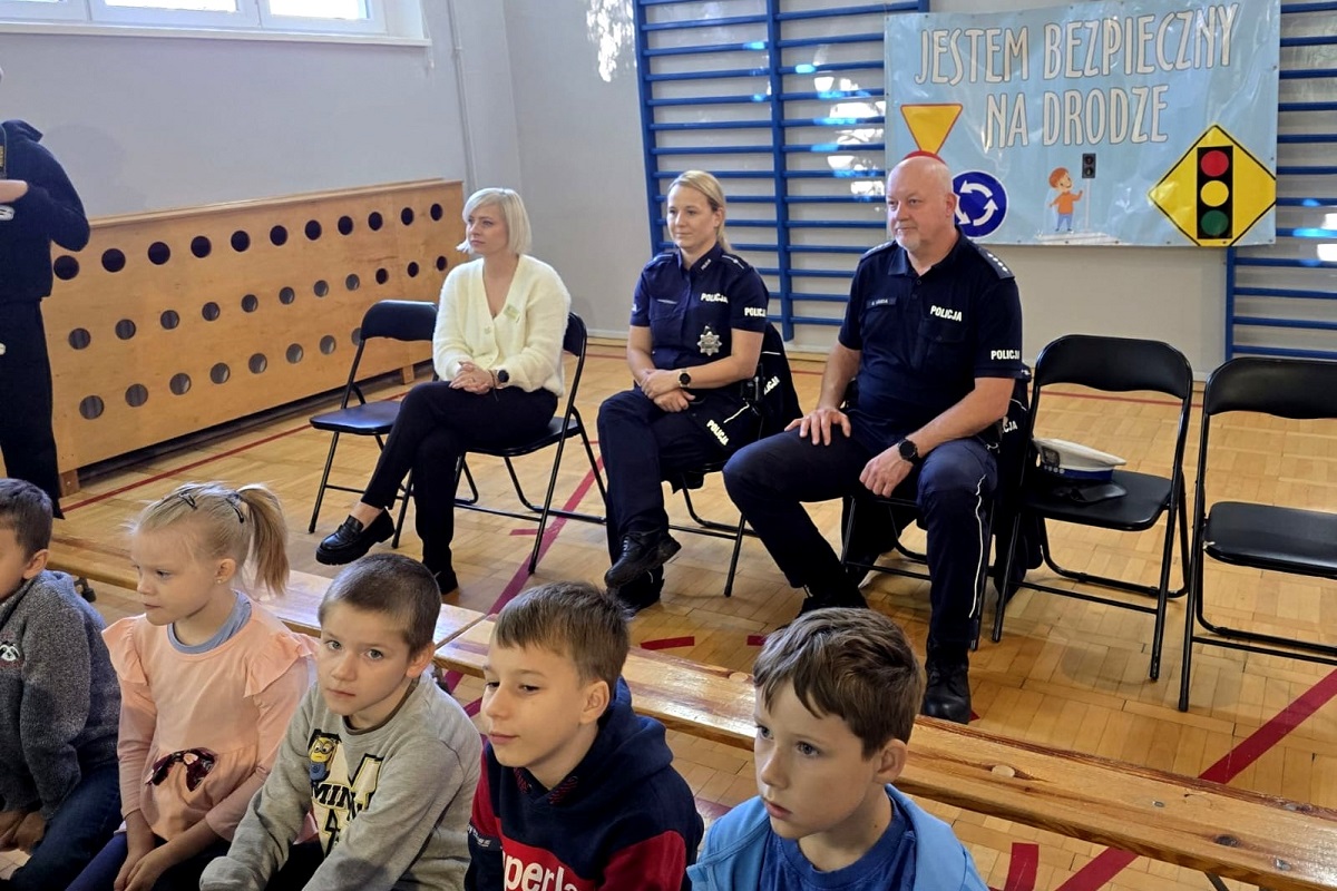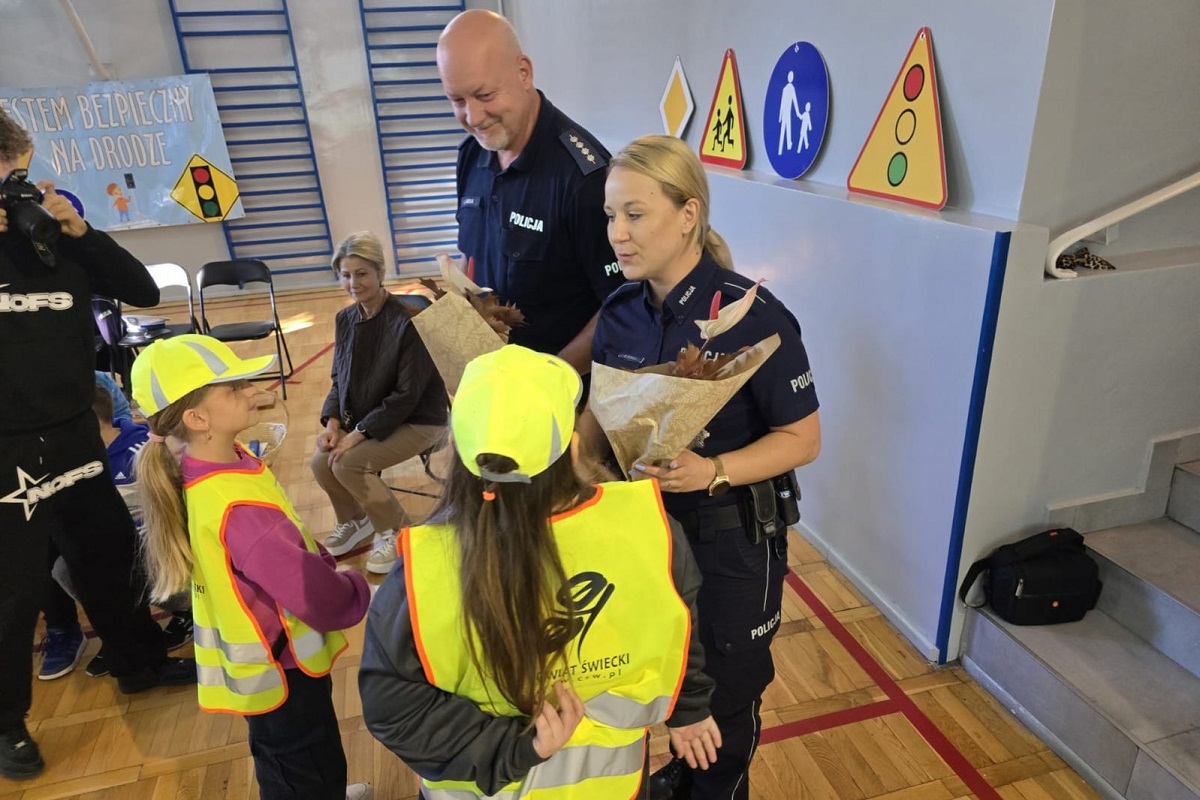 Po przedstawieniu policjant ruchu drogowego z komendy w Świeciu asp. szt. Arkadiusz Lauda oraz profilaktyk mł. asp. Małgorzata Frukacz przypomnieli uczniom zasady, którymi powinni się kierować, aby bezpiecznie poruszać się po drodze. Aby dalsza nauka „bezpieczeństwa” była dla najmłodszych szczególnie atrakcyjna mundurowi przekazali każdemu pierwszakowi ulotkę edukacyjną. Dzieci wyposażone zostały również w elementy odblaskowe, aby teraz mogły „świecić przykładam”.