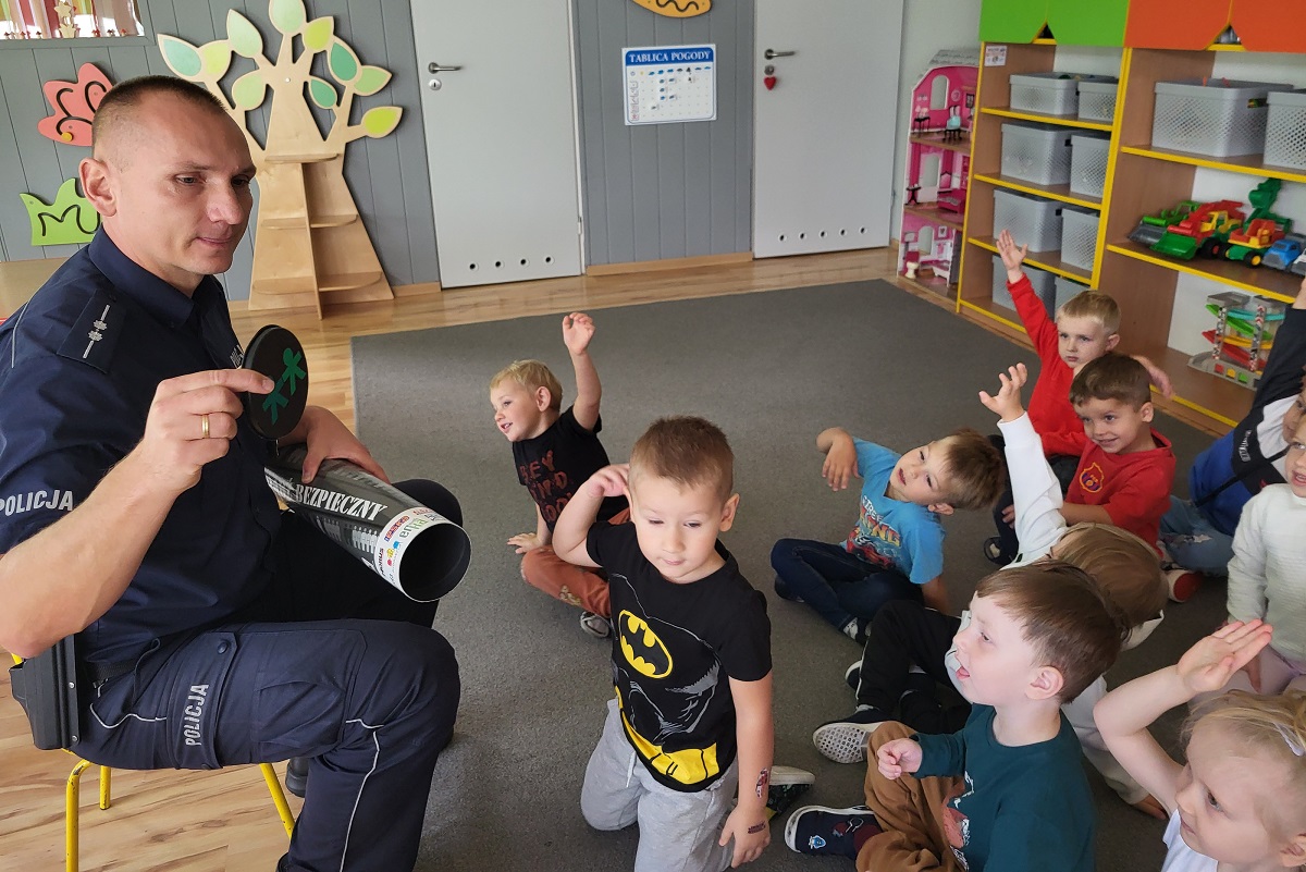 Przedszkolaki bardzo aktywnie uczestniczyły w spotkaniu i chętnie dzieliły się wiedzą o zasadach przechodzenia przez jezdnię i innymi umiejętnościami.