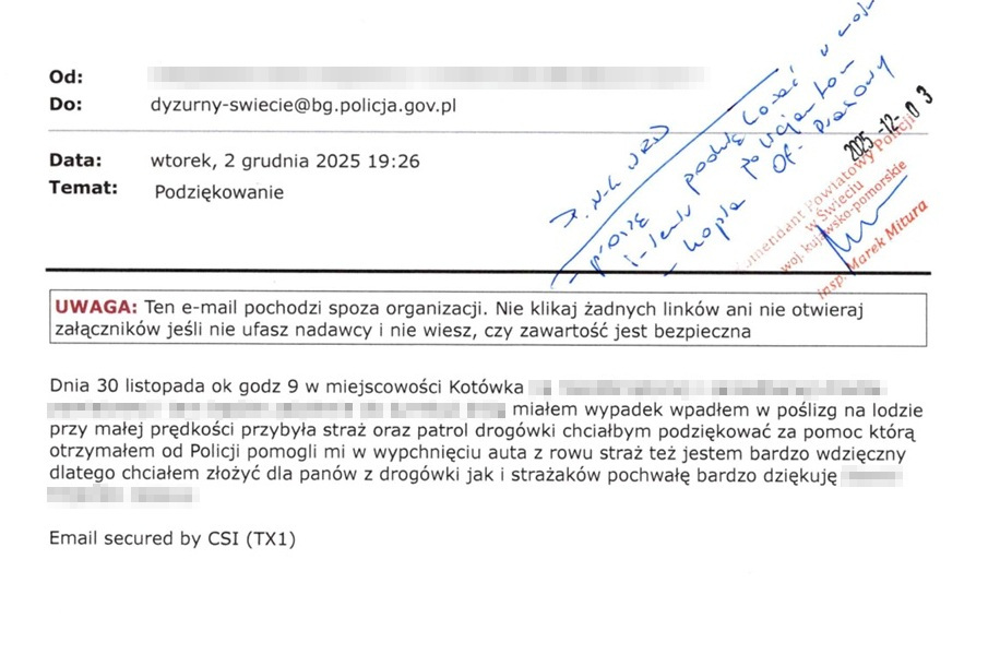 Na skrzynkę mailową Komendy Powiatowej Policji w Świeciu, wpłynęło podziękowanie dla funkcjonariuszy ruchu drogowego. Wiadomość napisał mężczyzna, który podczas podróży samochodem wpadł w poślizg i wjechał do rowu. Pomocy udzielił mu między innymi policyjny patrol. Wspólnie z kierowcą i strażakami wyciągnęli samochód na jezdnię. W takich sytuacjach hasło „Pomagamy i Chronimy" ma szczególne znaczenie.