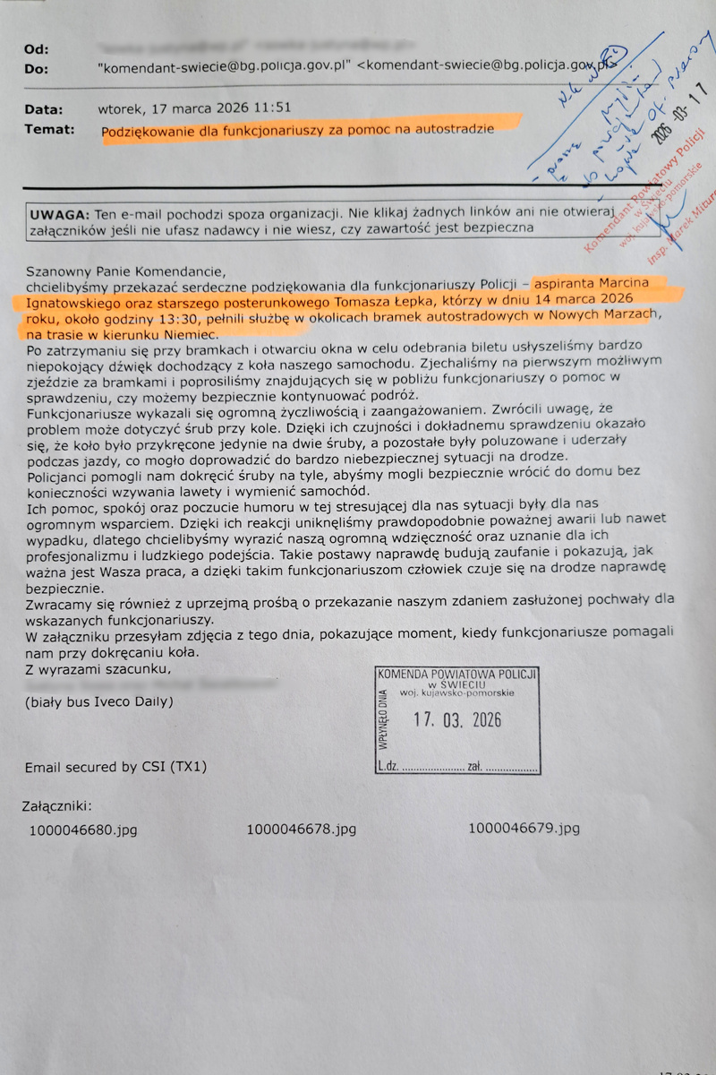 Osoby, którym udzielono wsparcia na skrzynkę Komendanta Powiatowego Policji w Świeciu wysłały e-maila. Podkreśliły w swoim podziękowaniu ogromną życzliwość, profesjonalizm oraz zaangażowanie funkcjonariuszy. Zaznaczyły, że szybka reakcja policjantów pozwoliła uniknąć poważniejszych konsekwencji i znacząco wpłynęła na ich poczucie bezpieczeństwa.