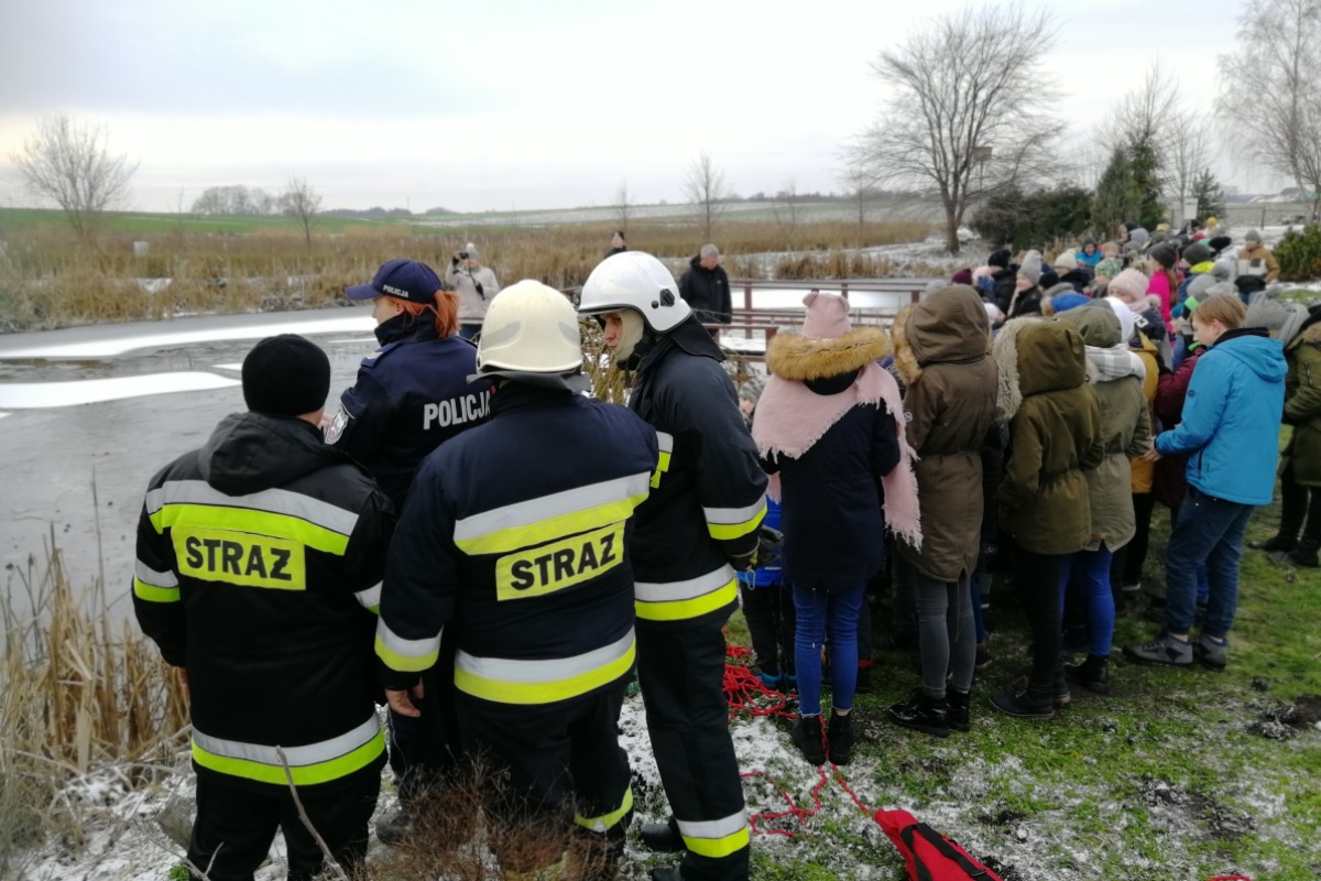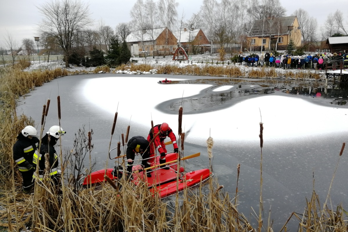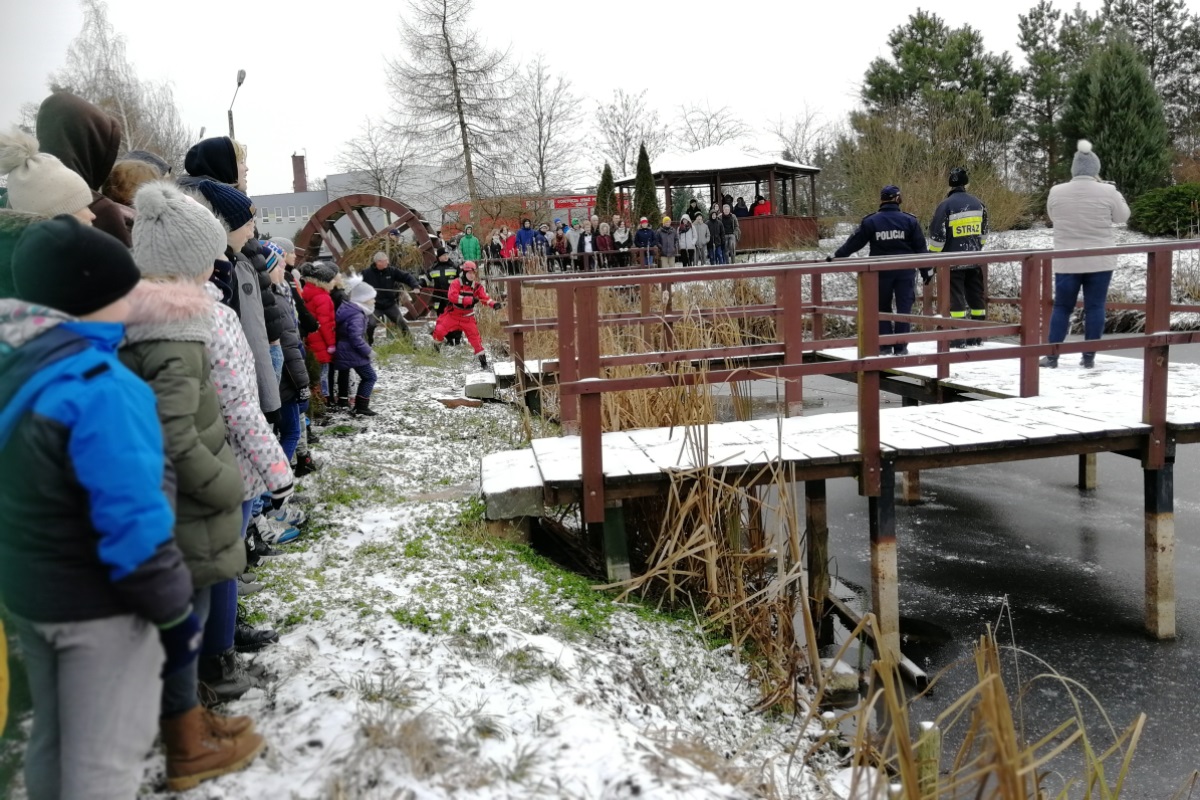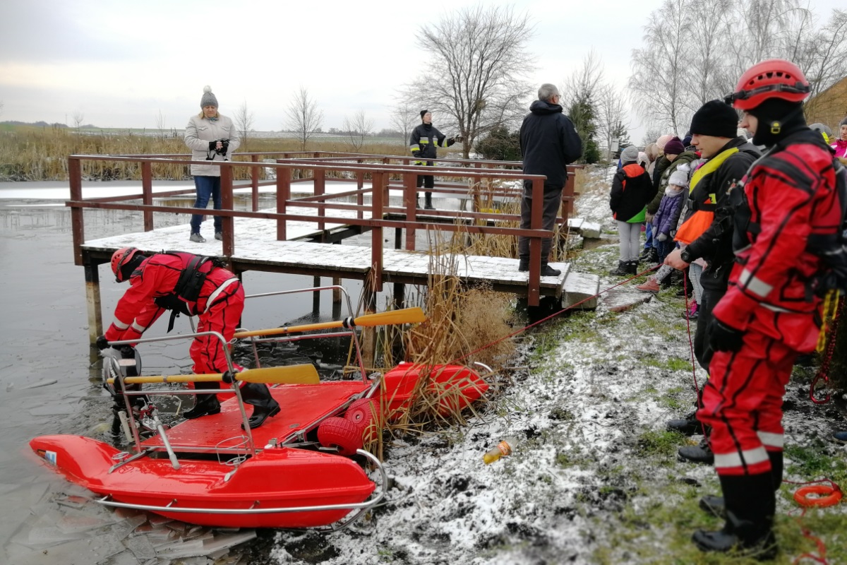 W tym roku mundurowi przygotowali dla słuchaczy niespodziankę. Na mieszczącym się w pobliżu szkoły stawie, przygotowali pokaz ratownictwa lodowego. W tym czasie strażacy przestrzegali dzieci przed skutkami nieodpowiedzialnych zabaw. Mówili m.in. o tym jak groźny dla zdrowia może być dym oraz o tym, że zabawy na cienkim lodzie mogą mieć niebezpieczne dla życia konsekwencje.